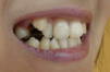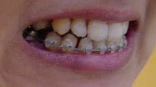写真ではちょっとわかりづらいけど、八重歯(犬歯)の下になっている歯(黒く影になっている所)を抜歯しました。次回には上側の歯にかなり装置が着くらしい(現在は6本のみ)。 |